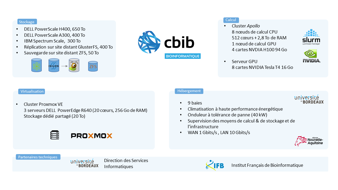 3 serveurs DELL PowerEdge R640 (2 CPU Xeon 4114, 20 coeurs, 256Go) + stockage dédié partagé (20To)